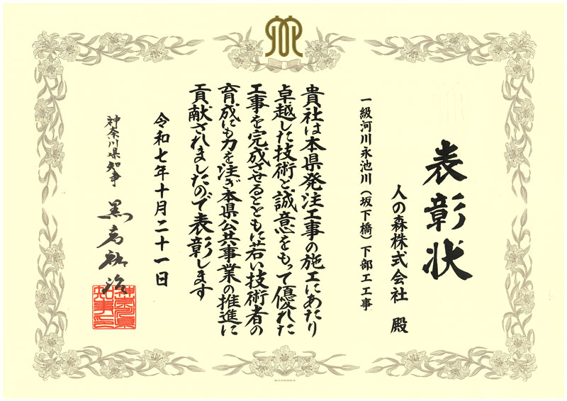 この度 社会環境を支える部が施工した「一級河川永池川(坂下橋)下部工工事」が 令和7年度 神奈川県知事表彰 若手育成奨励 県域建設部門を受賞いたしました。