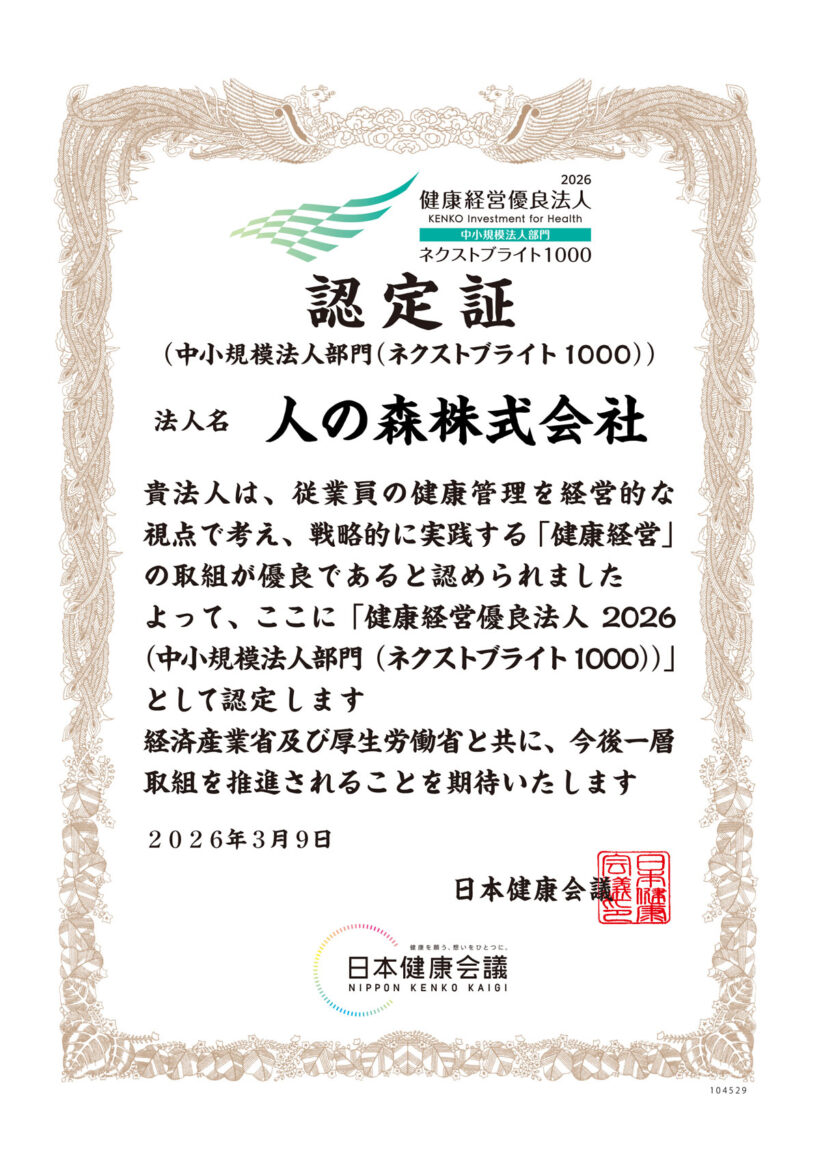 人の森株式会社は、経済産業省 健康経営優良法人認定制度において『健康経営優良法人2026 (中小規模法人部門 (ネクストブライト1000))』に認定されました。